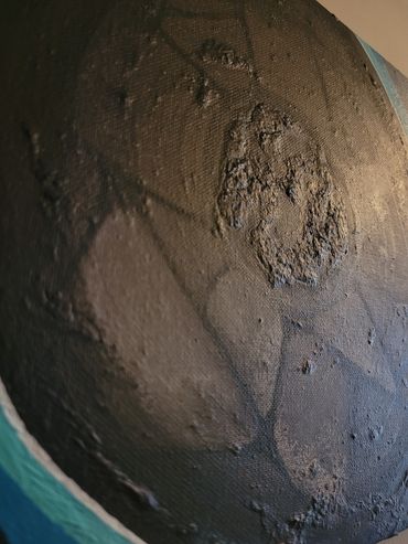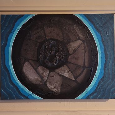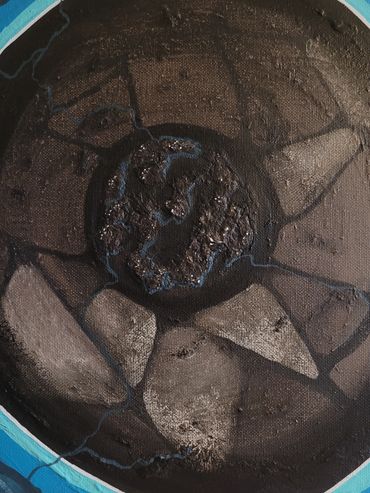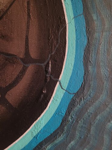 Dit schilderij is geïnspireerd op een drakensteen/septarie. Een kristal met een prachtige tekening aan de buitenkant met kwetsbaar gefonkel wat je mee naar binnen neemt.