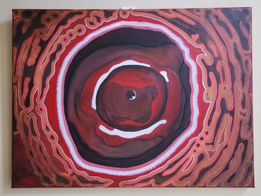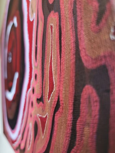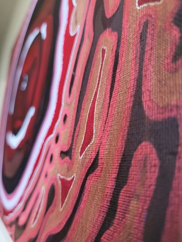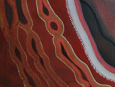 Dit schilderij is geïnspireerd op het in zoomen van ons menselijk lijf. Wat stroomt er door je aderen? Wie mag je zijn in de kern? Waar put jij je kracht uit? Hoe verhoud jij je tot de buitenwereld en hoe ga je hiermee om?